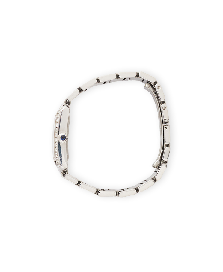 Циферблат: белый, c римскими цифрами, синие стрелки в форме мечей из вороненой стали, c тиснением «Cartier», с функцией даты